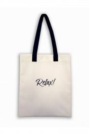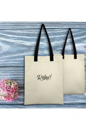 Сумка прямоугольной формы. С лицевой стороны нанесена термопечать "Relax”, контрастного цвета. По верху сумки закреплены две стандартные ручки, контрастного цвета. размер 35*42 см