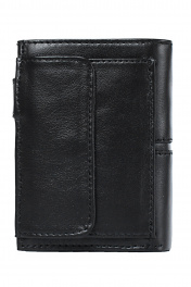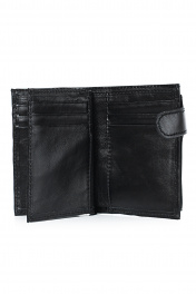 Портмоне закрывается клапаном на кнопку, с краями в загибку, с обстрочкой корпуса, с объемным карманом для монет, закрывающимся клапаном на кнопку, с декоративной вставкой на корпусе. Фурнитура - никель. Размеры: 85x115x10