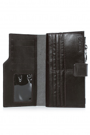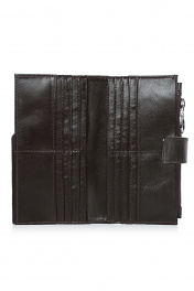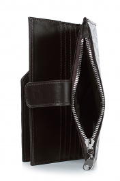 Портмоне на два отделения, одно отделение закрывается цупфером на кнопку, второе отделение для монет закрывается на застежку-молнию, с отделением для бумажных купюр, с открытыми карманами для пластиковых карт, с карманом с прозрачной вставкой. Цвет фурнит Размеры: