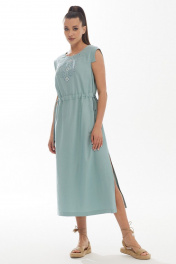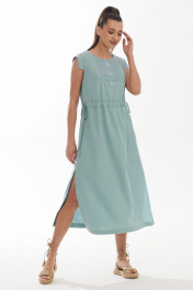 Платье женское прямого силуэта выполнено из льняной ткани с добавлением вискозы. Горловина круглая с застежкой на спинке на пуговицу. Рукав фантазийной формы. На центральной детали переда расположена вышивка в народном стиле. На талии настрочены короткие кулиски по центру спинки и переда, в которые продет декоративный шнур. В боковых швах по низу имеются разрезы по обеим сторонам. Длина изделие/рукав: 122/3,5
