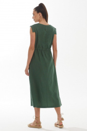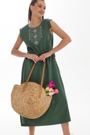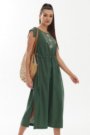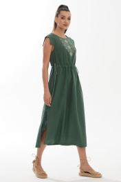Платье женское прямого силуэта выполнено из льняной ткани с добавлением вискозы. Горловина круглая с застежкой на спинке на пуговицу. Рукав фантазийной формы. На центральной детали переда расположена вышивка в народном стиле. На талии настрочены короткие кулиски по центру спинки и переда, в которые продет декоративный шнур. В боковых швах по низу имеются разрезы по обеим сторонам. Длина изделие/рукав: 122/3,5