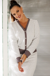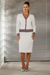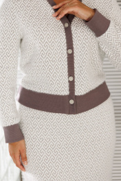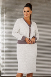Костюм женский изготовлен из трикотажной ткани.Низ жакета, рукава и край борта обработан довязом. Жакет имеет v-образный вырез. Застёгивается на четыре петли пуговицы. Юбка прямая, на подкладке, на поясе, слегка зауженная к низу. Длина ниже линии колена. Средний шов юбки заканчивается шлицей. Длина Жакет/рукав 55/61, длина юбка 72