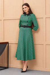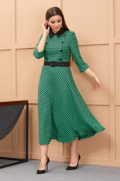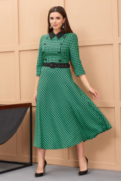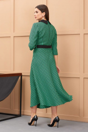Платье женское полуприлегающего силуэта, изготовлено из текстильного полотна костюмно- плательной группы. Платье отрезное по линии талии.Спереди по рельефам имитация застёжки на четыре пуговицы. Спинка со средним швом в котором обработана потайная молния. Молния также обработана и в боковом шве.Рукава одношовные 3/4.Юбка "клеш" ложится мягкими фалдами. Длина платья ниже щиколотки. Линия талии припоясывается припоясывается пояском, воротник отложной на стойке пошит из отделочной ткани. Платье/рукав 121/45