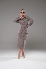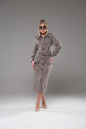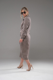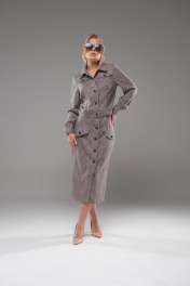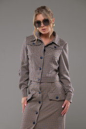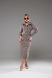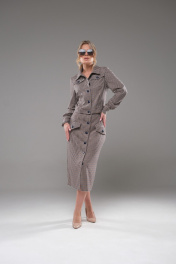 Костюм женский жакет+ юбка приталенного силуэта, выполнен из текстильного полотна костюмно- плательной группы. Перед с нагрудной вытачкой идущей от бокового шва, накладными карманами с клапаном. На планке расположены 5 пуговиц. Спинка со средним швом. По низу жакета обработан пояс. Воротник стояче отложной. Рукава одношовные заканчивающиеся манжетой. Юбка прямая, на поясе спереди застёгивается на пуговицы. По переду расположены накладные клапаны. На клапанах расположены декоративные пуговицы в цвет основных.