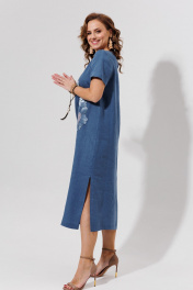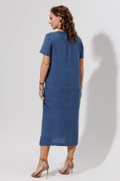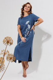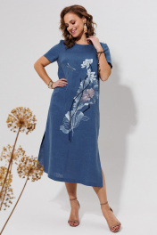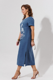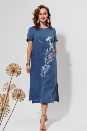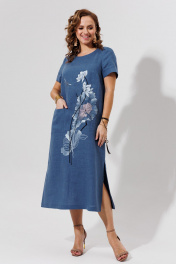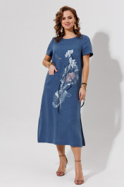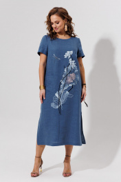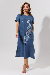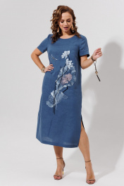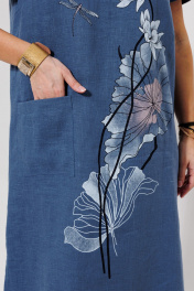 Платье женское слегка расклешённое к низу, льняное. На переде расположена декоративная печать. Нагрудная вытачка идёт с боковых швов. На правой половине расположен накладной карман. Спинка со средним швом, в котором расположена застёжка горловины на одну пуговицу. Горловина круглой формы. По боковым швам имеются разрезы. Рукава короткие, одношовные. Длина изделие/рукав: 114/21 см.