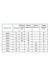 Комплект 2-х предметный. Жакет на подкладке. Застежка на молнии. Горловина, низ рукава, вход в карман и низ жакета обработаны элатичной тесьмой. Юбка на подкладке. Прямого силуэта зауженная к низу. Верх на поясе. Передняя половинка с разрезом в среднем шве с карманами с отрезным бочком. В задних половинках юбки отрезные кокетки косые и потайная молния в среднем шве. длина жакета - 59см, длина рукава - 60см, длина юбки - 69см.