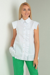 Комплект 2-х предметный. Блуза хлопок прямого силуэта, с центральной застежкой на петли-пуговицы и рюшей по одной стороне. По низу блузы переда и спинки ассиметричные рюши разной ширины. Рукав короткий "крылышко". Брюки укороченные, низ на манжете с разрезом в шве. Верх брюк на поясе с частичной резинкой по спинке. Два рабочих кармана. Застежка на молнию и петля пуговица на поясе. Заужены к низу. блуза длина-68см, брюки длина по боковому шву-96см, длина по шаговому шву-66см