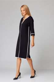 Платье прямого силуэта выполнено из плотного трикотажа с нейлоном. Держит форму, не вытягивается. Фигурная форма горловины обработана бейкой из контрастного по цвету трикотажа и переходит в кант по центру полочки. Закругленные углы низа переда и спинки разделены узким бочком. Линия плеча немного спущена, рукав втачной 3/4. Длина платья 104см, длина рукава 55см