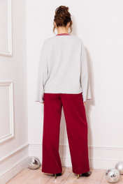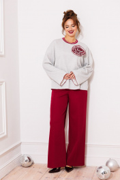 Джемпер свободного силуэта выполнен из трикотажной ткани с люрексом. Горловина округлой формы обработана довязом. Рукав втачной со спущенным плечом. Низ рукава и низ изделия обработаны декоративной строчкой. К джемперу прилагается съемное декоративное украшение цветок. Длина джемпера: 64 см, длина рукава джемпера 54 см.