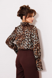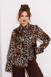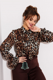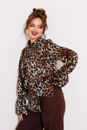 Блузка свободного силуэта выполнена из блузочного атласа. Перед с нагрудной вытачкой. Застежка центральная с отрезной планкой на петли и пуговицы. Воротник со стойкой. В правой части переда в планку вставлена рюша. Рукав втачной одношовный со сборкой на резинку в нижней части с образованием волана. В боковых швах разрезы. Пуговица на стойке декоративная.Фурнитура может быть изменена с сохранением художественного образа. Длина блузки - 68 см, длин рукава блузки - 64 см.