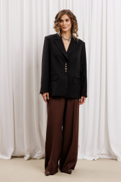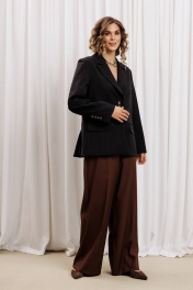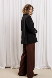Жакет прямого свободного силуэта из костюмной ткани. Воротник пиджачного типа, застежка обнобортная на 4 петли и пуговицы. Перед с талиевой вытачкой и карманом с клапаном в рамку, с рельефом. Спинка со средним швом и рельефами, в рельефах шлица. Рукав втачной одношовный со шлицей и 4-мя пуговицами. Жакет на подкладке. Длина жакета- 70 см, длина рукава жакета - 60 м.