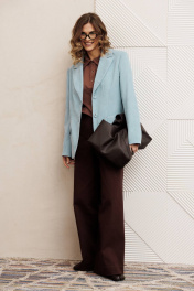 Жакет полуприлегающего силуэта из мягкой вельветовыой ткани. Застежка однобортная на две пуговицы, воротник пиджачного типа. Перед с талиевой вытачкой, рельефом и декоративным клапаном. Спинка с рельефами из проймы и средним швом. Рукав втачной двухшовный. Жакет на подкладке. Длина жакета - 68 см, длина рукава жакета - 60 см.