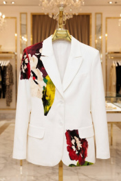 Жакет полуприлегающего силуэта из хлопковой ткани. Застежка однобортная на две пуговицы, воротник пиджачного типа. Перед с талиевой вытачкой, рельефом и декоративным клапаном. Спинка с рельефами из проймы и средним швом. Рукав втачной двухшовный. Жакет на подкладке. Длина жакета - 68 см, длина рукава жакета - 60 см.