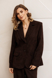 Жакет полуприлегающего силуэта из мягкой вельветовыой ткани. Застежка однобортная на две пуговицы, воротник пиджачного типа. Перед с талиевой вытачкой, рельефом и декоративным клапаном. Спинка с рельефами из проймы и средним швом. Рукав втачной двухшовный. Жакет на подкладке. Длина жакета - 68 см, длина рукава жакета - 60 см.