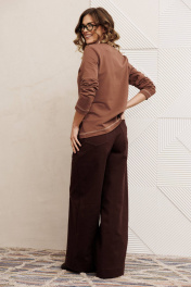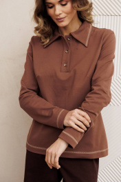 Джемпер прямого силуэта из трикотажного полотна. Перед с застежкой поло и нагрудными вытачками. По воротнику, низу изделия и низу рукава отстрочена декоративная строчка. Длина джемпера - 61 см, длина рукава - 61 см.