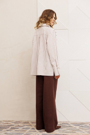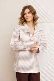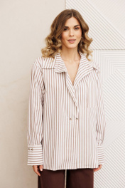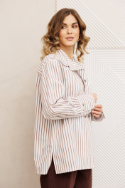 Рубашка свободного силуэта из хлопковой ткани в полоску. Перед с двубортной застежкой и карманом в районе груди. Воротник со стойкой. Спинка с кокеткой и складкой. Рукав втачной рубашечный с высокой манжетой на 2 петли и пуговицы. Длина рубашки - 70 см. Длина рукава - 60 см.