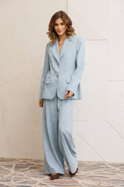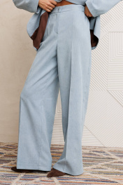 Брюки палаццо с притачным поясом из мягкой вельветовой ткани. Спереди застежка гульфик на молнии и петлей и пуговицей по поясу. По задней частям брюк вытачки. Пояс с резинкой в боковых частях. Брюки с заутюженными стрелками. Длина брюк с учетом пояса - 109 см.
