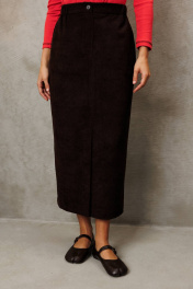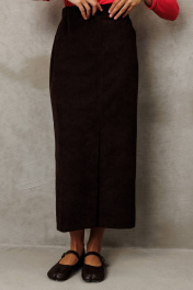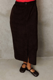 Юбка прямого силуэта выполненная из мягкой вельветовой ткани. Передняя честь юбки с вытачками, со средним швом и застежкой гульфиком на молнии и щлицей спереди. Задняя часть юбки с вытачками. Юбка на притачном поясе с затежкой на петлю и пуговицу спереди и резинками по бокам. Юбка на подкладке. Длина юбки с учетом пояса - 90 см.