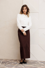 Юбка прямого силуэта выполненная из мягкой вельветовой ткани. Передняя честь юбки с вытачками, со средним швом и застежкой гульфиком на молнии и щлицей спереди. Задняя часть юбки с вытачками. Юбка на притачном поясе с затежкой на петлю и пуговицу спереди и резинками по бокам. Длина юбки с учетом пояса - 90 см.