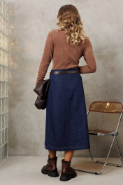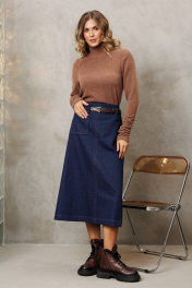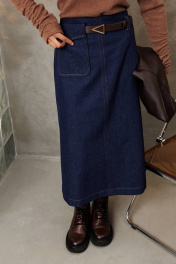 Юбка А-образного силуэта из плотного джинса. Передняя часть юбки со средним швом. С правой стороны вверху настрочен карман с клапаном- шлевкой. Задняя часть юбки со средним швом и вытачками. Сверху в среднем шве обработана потайная молния. Вдоль линии пояса настрочены шлевки. Пояс цельнокроеный на обтачке. Юбка на подкладке. Вдоль среднего шва по переду и по периметру кармана проложена декоративная строчка. К юбке прилагается сьемный ремень. Фурнитура может быть изменена с охранением художественного замысла. Длина юбки - 78 см, длина рукава - 60 см.