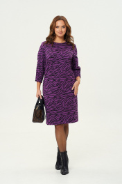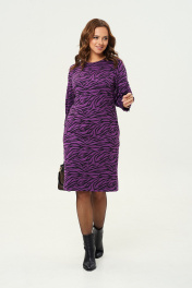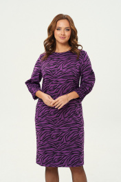 Платье прямого силуэта из трикотажной ткани. Перед с нагрудными вытачками из бокового шва. Спинка со средним швом, вверху шва обработан разрез с застежкой на петлю и пуговицу. Рукав одношовный втачной, по низу застрочены защипы. Длина спинки по среднему шву — 100см, длина рукава-45см.