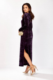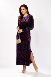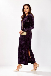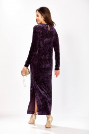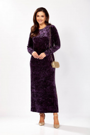 Платье прямого силуэта из бархата. В боковом шве разрез. Рукав втачной одношовный. По спинке застежка капелька на петлю и пуговицу. Длина платья - 136 см, длина рукава - 66 см.