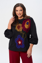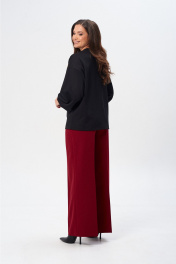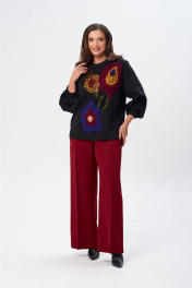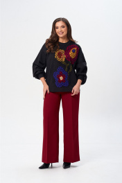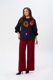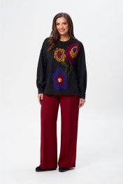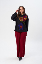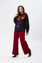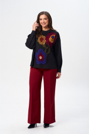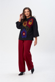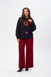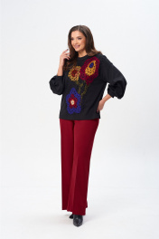 Джемпер свободного силуэта из трикотажной ткани с принтом. Рукав втачной одношовный со складками по низу и манжетой. Горловина обработана планкой. По переду поверх принта настрочена сетка. Сетка может быть заменена с сохранением художественного образа изделия. Брюки расширенные книзу с притачным поясом. Спереди застежка гульфик на молнии и петлей и пуговицей по поясу. По задней частям брюк вытачки. Пояс с резинкой в боковых частях. Брюки с заутюженными стрелками. Длина джемпера - 66 см, длина рукава джемпера - 53 см, длина брюк с учетом пояса - 109 см.