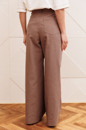 Костюм состоит из жакета и брюк. Жакет прямого силуэта сзади с имитацией куртки выполнен из хлопковой джинсовой ткани. Застежка однобортная на 2 петли и пуговицы. Воротник пиджачного типа. Перед с талиевой вытачкой, рельефом и декоративным клапаном. Спинка скокеткой и складкой. Рукав втачной двухшовный. Низ спинки и нижней части рукава собраны на резинку. Брюки расширеные книзу на притачном поясе. По поясу настрочены шлевки. По передним и задним частям брюк вытачки. На задних частях брюк настрочены карманы. Карманы, вытачки, пояс, низ брюк отделаны отделочной строчкой. Длина жакета - 70 см, длина рукава - 60 см. Длина брюк с учетом пояса -107 см
