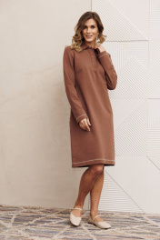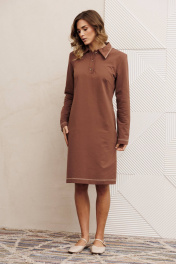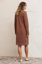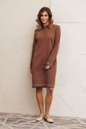 Платье слегка приталенного силуэта из плотного трикотажного полотна. Перед с застежкой поло и нагрудными вытачками. По воротнику и низу рукава настрочена декоративная тесьма. Длина платья 96 - см, длина рукава - 61 см.