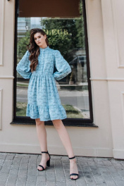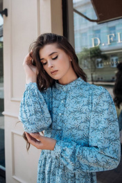 Платье свободного кроя с подрезом чуть выше линии талии и воланом по низу изделия. Рукав длинный, широкий присборен в низу на манжеты, с мягкой сборкой у проймы. Застежка горловины по центру переда на петли и пуговицы. По горловине воротник-стойка. На манжете петля и пуговица. Длина изделия р.42-44 - 94 см, р.46-50 - 93 см, р.52-56 - 96 см Длина рукава р.42-44 - 62 см, р.46-50 - 63 см, р.52-56 - 64 см