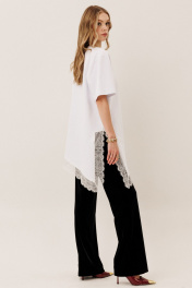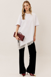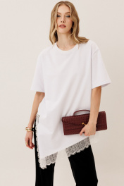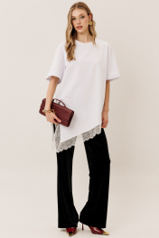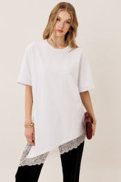 Ассиметричный крой+трендовое кружево = базовая футболка уже не базовая! Футболка: прямой силуэт oversize круглая горловина короткий рукав ассиметричный низ с кружевом Полуобхват груди футболки: 42 р - 56 см, 44 р - 58 см, 46 р - 60 см, 48 р - 62 см, 50 р - 64 см Длина рукава в футболке: 25 см Длина по спинке от горловины: 75-77 см