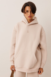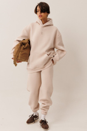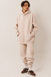 Женский тёплый уютный костюм. Подойдет для прогулок и отдыха. Изготовлен из футера с начесом, состоит из худи, покроя оверсайз и джоггеров. Худи имеет двойной капюшон и карман кенгуру. По центру переда вышивка-логотип в цвет ткани. Рукава имеют притачную манжету. Манжеты рукавов и низ изделия выполнены из ткани- компаньона кошкорсе. Брюки немного зауженные и низ присобран на резинку. Передние половинки имеют удобные карманы. Пояс с резинкой и шнурком внутри. Пояс выполнен из кошкорсе. Длина худи по спинке 71-75 см в зависимости от размера и роста;. Длина рукава+плечо от шва горловины: 67-69 см для роста 164-170, 70-72 см для роста 170-176. Полуобхват груди худи: 42 р - 60 см, 44 р - 62 см, 46 р. - 64 см, 48 р. - 66 см, 50 р. - 68 см, 52 р. - 70 см, 54 р - 72 см, 56 р - 74 см, 58 р - 76 см, 60 р - 78 см Длина брюк по боковому шву с поясом: 98-100 см для роста 164-170 см, 100-102 см для роста 170-176 см Полуобхват бедер брюк: 42 р - 49 см, 44 р - 51 см, 46 р. - 53 см, 48 р. - 55 см, 50 р. - 57 см, 52 р. - 59 см, 54 р - 62 см, 56 р - 64 см, 58 р - 66 см, 60 р - 68 см