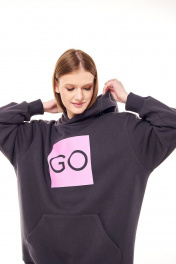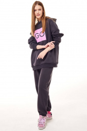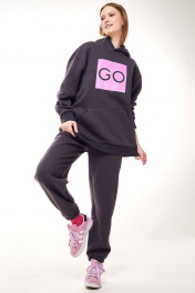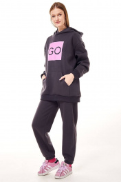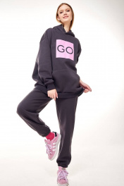 Женский тёплый уютный костюм. Подойдет для прогулок и отдыха. Изготовлен из футера с начесом, состоит из худи, покроя оверсайз и джоггеров. Худи имеет двойной капюшон и карман кенгуру. По центру переда контрастная печать GO. Рукава имеют притачную манжету. Манжеты рукавов и низ изделия выполнены из ткани- компаньона кошкорсе. Брюки немного зауженные и низ присобран на резинку. Передние половинки имеют удобные карманы. Пояс с резинкой и шнурком внутри. Пояс выполнен из кошкорсе. Длина худи по спинке 71-75 см в зависимости от размера и роста. Длина рукава+плечо от шва горловины: 67-69 см для роста 164-170 см, 70-72 см для роста 170-176 см. Полуобхват груди худи: 42 р - 60 см, 44 р - 62 см, 46 р. - 64 см, 48 р. - 66 см, 50 р. - 68 см, 52 р. - 70 см, 54 р - 72 см, 56 р - 74 см, 58 р - 76 см, 60 р - 78 см. Длина брюк по боковому шву с поясом: 98-100 см для роста 164-170 см, 100-102 см для роста 170-176 см. Полуобхват бедер брюк: 42 р - 49 см, 44 р - 51 см, 46 р. - 53 см, 48 р. - 55 см, 50 р. - 57 см, 52 р. - 59 см, 54 р - 62 см, 56 р - 64 см, 58 р - 66 см, 60 р - 68 см.