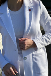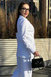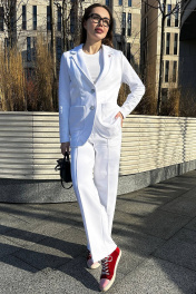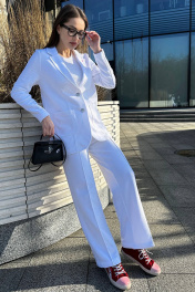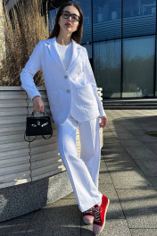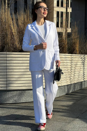Костюм Gowear из футера в стиле smart casual поможет создать в меру строгий и одновременно расслабленный образ. Костюм состоит из жакета и прямых брюк. Жакет прямого силуэта с воротником и лацканами, имеет удобные карманы и застежку на 2 пуговицы. На левом лацкане вышивка-логотип в контрастном цвете. Низ и борта имеют открытые края (эффект необработанного шва), укреплены дополнительной строчкой. Жакет без подкладки. Брюки прямые. На передних половинках - отделочная строчка по стрелкам и удобные боковые карманы. Пояс из ткани кошкорсе, с резинкой и контрастным шнурком. Длина жакета по спинке 72-74 см. Длина рукава жакета: 60-62 см для роста 164-170 см, 62-64 см для роста 170-176 см. Полуобхват груди жакета: 42 р - 48 см, 44 р - 50 см, 46 р. - 52 см, 48 р. - 54 см, 50 р. - 56 см, 52 р - 58 см. Длина брюк по боковому шву с поясом: 102-104 см для роста 164-170 см, 105-107 см для роста 170-176 см. Полуобхват бедер брюк: 42 р - 48 см, 44 р - 50 см, 46 р. - 52 см, 48 р. - 54 см, 50 р. - 56 см, 52 р. - 58 см.