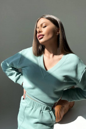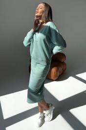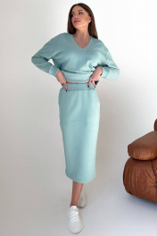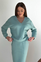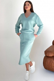 Женский комплект, состоящий из юбки и джемпера с v-образным вырезом. Джемпер классического покроя с немного спущенной линией плеча. Бейка горловины, манжеты рукавов и низ изделия выполнены из ткани-компаньена кашкорсе. Слева на переде свитшота вышит логотип в цвет ткани. Юбка длиной миди с разрезом на спинке. Спереди накладные удобные карманы. Пояс из ткани компаньона кошкорсе с резинкой внутри. Длина джемпера по спинке 63–66 см. Длина рукава от горловины: 70-72 см для роста 164-170 см, 72-74 см для роста 170-176 см; Полуобхват груди свитшота: 42 р. - 60 см, 44 р. - 62 см, 46 р. - 64 см, 48 р. - 66 см, 50 р. - 68 см,, 52 р. - 70 см. Длина юбки: 80 см для роста 164-170, 170-176. Ширина юбки по бедрам:42 р. - 46 см, 44 р. - 48 см, 46 р. - 50 см, 48 р. - 52 см, 50 р. - 54 см, 52 р. - 56 см.