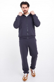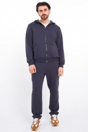 Повседневный мужской спортивный костюм из комфортной ткани (футера без начёса), который подойдёт для дома, прогулок, путешествий и просто отдыха. Состоит из худи и брюк. Худи – прямого силуэта, с двойным капюшоном и застежкой - молнией по переду. По низу изделие имеет притачную манжету. На переде худи дизайнерские горизонтальные подрезы и удобные карманы обработаны в наклонных швах. Вышивка - логотип в цвет ткани на левой стороне переда. Рукава втачные одношовные длинные с притачной по низу манжетой из ткани компаньона - кашкорсе. Отделочные строчки вдоль молнии, по рельефным швам и входам в карманы. Брюки немного зауженные к низу. Притачной пояс выполнен из ткани компаньона - кошкорсе. Пояс на резинке и со шнурком внутри. Передняя половинка брюк с боковыми карманами. Длина джемпера по спинке: 67-69 см. Длина рукава: 66-68 см для роста 176-182, 70-72 см для роста 182-188. Полуобхват джемпера по груди: 53 см для 46 р, 55 см для 48 р, 57 см для 50 р, 59 см для 52 р, 61 см для 54 р, 63 см для 56 р, 65 см для 58 р, 67 см для 60 р, 69 см для 62 р. Длина брюк по боковому шву с поясом: 107-109 см для роста 176-182, 112-114 см для роста 182-188. Полуобхват бедер в брюках: 49 см для 46 р, 51 см для 48 р, 53 см для 50 р, 55 см для 52 р, 57 см для 54 р, 59 см для 56 р, 61 см для 58 р, 63 см для 60 р, 65 см для 62 р.