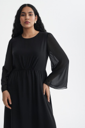 Платье отрезное по линии талии, без воротника, с круглым вырезом горловины, с застежкой на потайную молнию в среднем шве спинки. Шов по талии присборен. Верхняя часть переда частично присборена по талиевому шву. Спинка со средним швом. Нижняя часть платья с юбкой- солнце. Рукав втачной, длинный, расширенный к низу, со сборкой по окату. Платье на подкладке.
