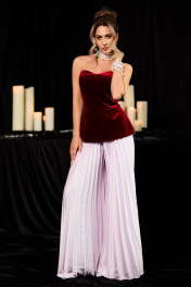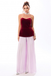Брюки- гофре расширенного силуэта, с отрезным поясом, без застежки, верх брюк присборен на резинку. Брюки без боковых швов. Силуэт: расширенные