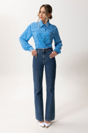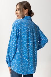 Блузка, с центральной застежкой на петли и пуговицы по планке переда, с втачным воротником с отрезной стойкой. По полочкам на уровне груди односторонняя складка. По спинке от горловины расположены две односторонние частично стачные складки. Линия низа фигурная. Рукав втачной, длинный, с отрезной манжетой. Манжета застегивается на две петли и пуговицы.