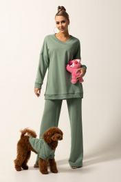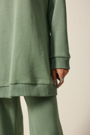Блузон в стиле оверсайз, с V-образным вырезом горловины. По горловине- втачная планка. Плечо спущенное, рукав длинный. По низу блузона- притачной пояс.