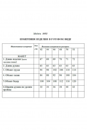 Жакет с центральной застежкой на петли и пуговицы, втачным воротником, отложными лацканами. По переду с рельефами, выходящими из проймы, талиевыми вытачками, переходящими в подрез, накладными карманами. Спинка со средним швом, рельефами, выходящими из проймы. Силуэт: полуприлегающий Вид покроя рукава: втачной длинный Цветовая гамма для верха, подкладки, фурнитуры, отделки: жакет из эластичной ткани в одной цветовой гамме. Комплектация: жакет на подкладке