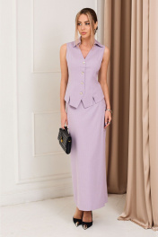 Жилет с центральной застежкой на петли и пуговицы, с втачным воротником с отрезной стойкой, с V-образным вырезом горловины. По переду с рельефами, выходящими из плеча до низа. Низ жилета фигурный. По рельефам переда- разрезы. Спинка со средним швом, рельефами, выходящими из плеча до низа. Силуэт: полуприлегающий жилет на подкладке