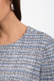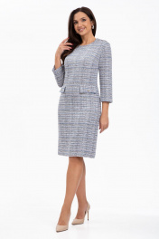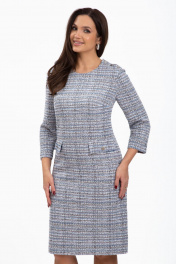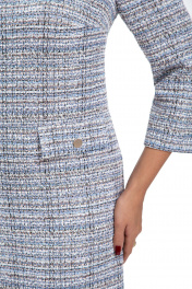 Платье с застежкой на потайную молнию в среднем шве спинки, без воротника, с круглым вырезом горловины, и доплнительной застежкой на петли и пуговицы по левому плечевому шву. По переду с нагрудными вытачками. На уровне линии бедер расположены отделочные клапаны, зафиксированные к Платье на подкладке