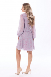 Платье с застежкой на потайную молнию в среднем шве спинки, без воротника, с V-образным вырезом горловины. По переду с нагрудными вытачками. Платье отрезное по линии талии. Шов по талии с воланом. Спинка со средним швом, талиевыми вытачками по верхней части спинки. По горловине переда- шнур- завязка. Рукав втачной, длинный. Окат рукава со сборкой. Низ рукава присборен на резинку. Платье на подкладке.