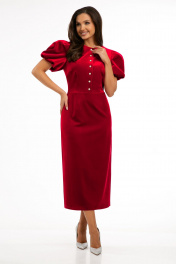 Платье без воротника, с круглым вырезом горловины, центральной застежкой на петли и пуговицы по лифу переда. Платье отрезное по линии талии. По лифу переда с нагрудными вытачками. Спинка со средним швом, заканчивающимся разрезом, талиевыми вытачками. Рукав втачной, короткий, по низу, присборен на резинку. Окат рукава присборен. Цветовая гамма для верха, подкладки, фурнитуры, отделки: платье из ткани в одной цветовой гамме. платье на подкладке