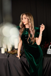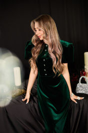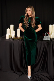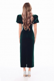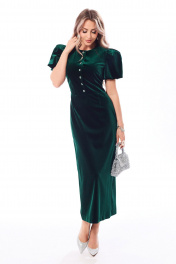 Платье без воротника, с круглым вырезом горловины, центральной застежкой на петли и пуговицы по лифу переда. Платье отрезное по линии талии. По лифу переда с нагрудными вытачками. Спинка со средним швом, заканчивающимся разрезом, талиевыми вытачками. Рукав втачной, короткий, по низу, присборен на резинку. Окат рукава присборен. Цветовая гамма для верха, подкладки, фурнитуры, отделки: платье из ткани в одной цветовой гамме. платье на подкладке