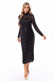 Платье с отрезным воротником- стойкой, застежкой на навесные петли и пуговицы по горловине спинки. По переду и спинке с отрезной кокеткой. Нижняя часть спинки со средним швом, талиевыми вытачками. Левый боковой шов с разрезом. Рукав втачной, длинный. Цветовая гамма для верха, подкладки, фурнитуры, отделки: платье из ткани в одной цветовой гамме. Рукава, кокетки переда и спинки выполнены из сетки, основные детали переда и спинки- из сетки с пайетками.