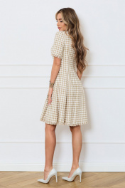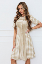 Платье с центральной застежкой на петли и пуговицы, без воротника, с круглым вырезом горловины. По переду с рельефами, выходящими из плеча до низа. Спинка со средним швом, рельефами, выходящими из плеча до низа. Рукав втачной, короткий. По горловине, краю борта, низу и низу рукавов – отделка в виде бахромы из основной ткани. Силуэт: полуприлегающий Вид покроя рукава: втачной, короткий