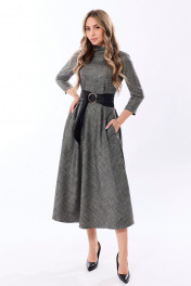 Платье с центральной застежкой на потайную молнию в среднем шве спинки, цельнокроенной стойкой с вытачками. Платье отрезное по линии талии. Верхняя часть переда с нагрудными вытачками. Верхняя часть спинки со средним швом. В боковых швах расположены карманы. Платье со съемным поясом.