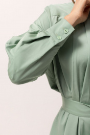 Платье свободного трапециевидного силуэта, с центральной застежкой на петли и пуговицы, с отрезной стойкой. Кокетка платья без плечевого шва. Полочки по шву притачивания кокетки с односторонними складками. Спинка по шву притачивания кокетки с встречной складкой. Платье со съемным поясом. Рукав втачной, длинный, с отрезной манжетой. Платье без подкладки.